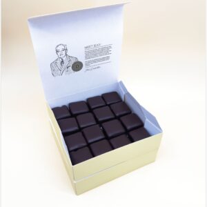 Guimauve artisanale à la vanille, délicatement fondante, découpée en cubes puis enrobée d’un chocolat noir belge intense. Une double texture irrésistible, entre douceur aérienne et croquant subtil, qui réveille instantanément les plus gourmands souvenirs d’enfance.