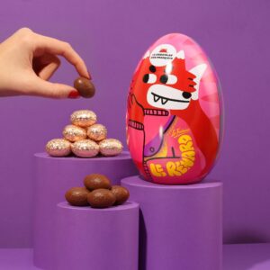 Un écrin illustré qui renferme de petits œufs en chocolat au lait, fourrés au praliné noisettes et rehaussés d’éclats de caramel.