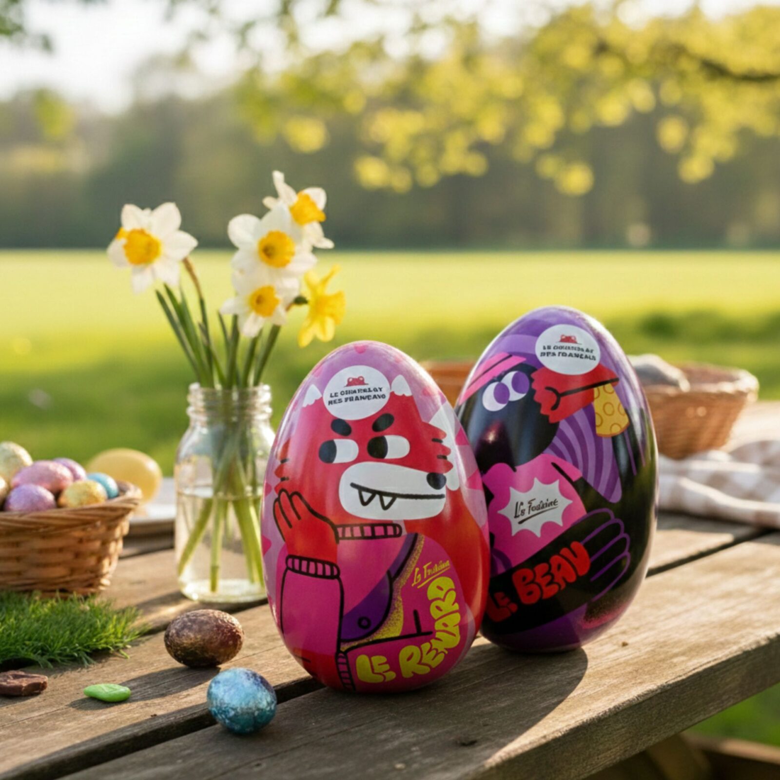 OEUF MÉTAL GARNI D’OEUFS PRALINÉ NOISETTES & CARAMEL, CHOCOLAT AU LAIT – LE CORBEAU ET LE RENARD
